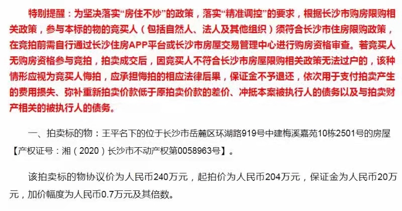 能撿漏是因為公告寫了要購房資格,別人都不敢拍。我們判斷是不要資格的,所以讓L總拍。L總也沒有長沙購房資格,信了我們的拍了,拍到了,結(jié)果大家也看到了,過戶收房了,撿了這個漏。