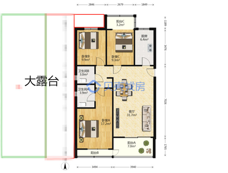 最大的亮點(diǎn)是露臺(tái),露臺(tái)怕有兩三百個(gè)平方,蓋瓦的部分應(yīng)該不能用,但實(shí)際能用的位置也有四五十平,真的爽。