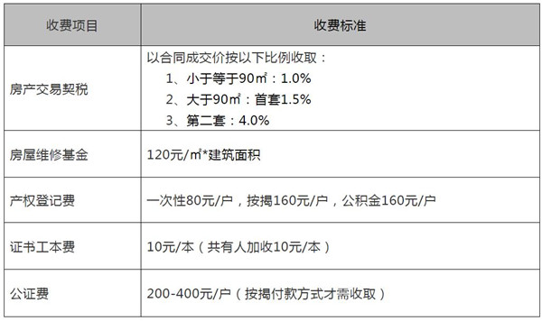 新房方面,交易稅費(fèi)比較簡(jiǎn)單,主要是契稅和房屋維修基金。收費(fèi)項(xiàng)目一般都會(huì)在售樓部公示,可以套用下面的表格,核算應(yīng)繳稅費(fèi)。